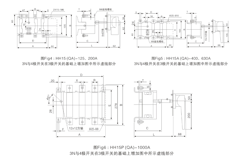 HH15A(QA)-125~1000A的外形与安装尺寸(见图4-6、表5)