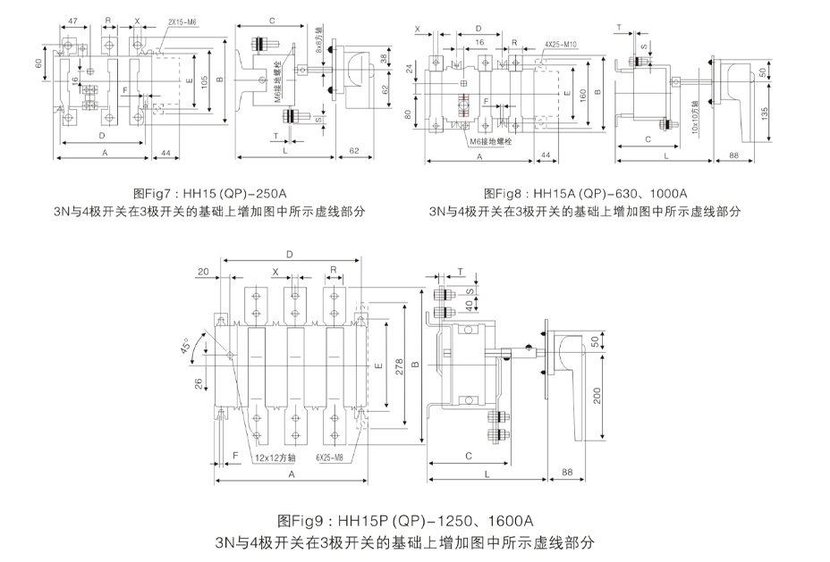 HH15P(QP)-250~1600A的外形与安装尺寸(见图7-9、表6)