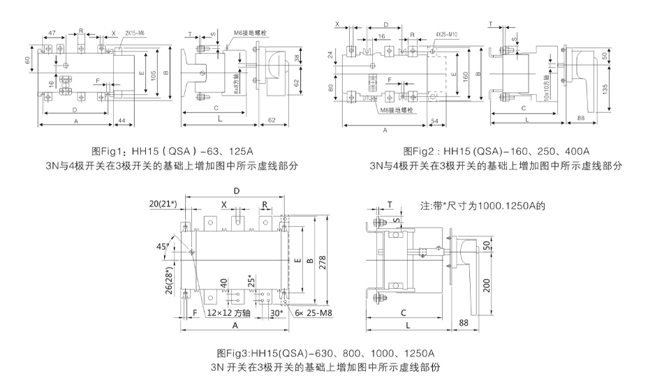 HH15A(QA)-125~1000A的外形与安装尺寸
