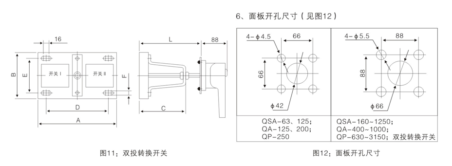 5、双投转换开关由两台相应的单投开关在底板左右并排组装而成,其外形与安装尺寸(见表8、图11)